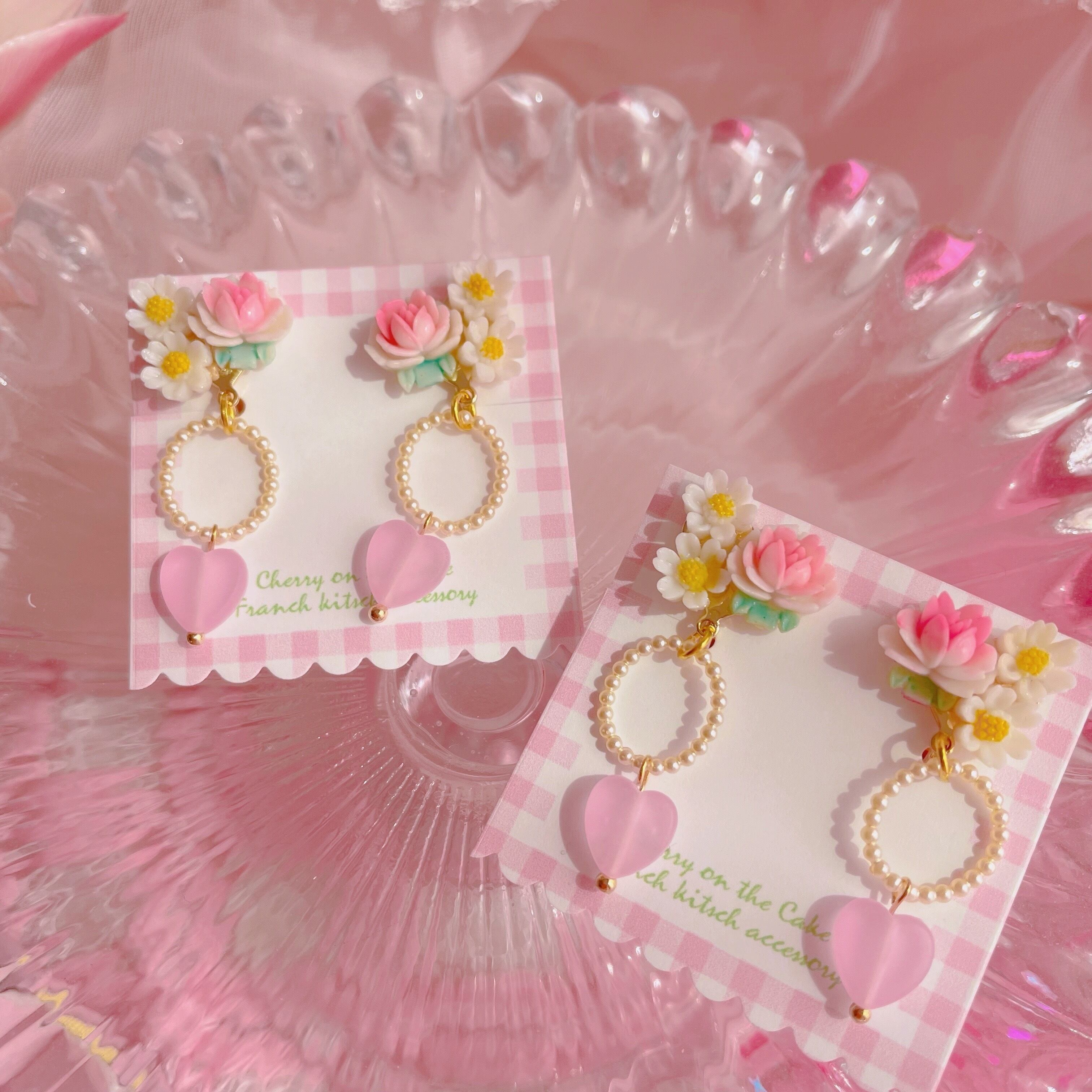 淡いローズカボションに小さなデイジーを合わせ、ヴィンテージパールフープにピンクのフロストハートビーズを合わせました。