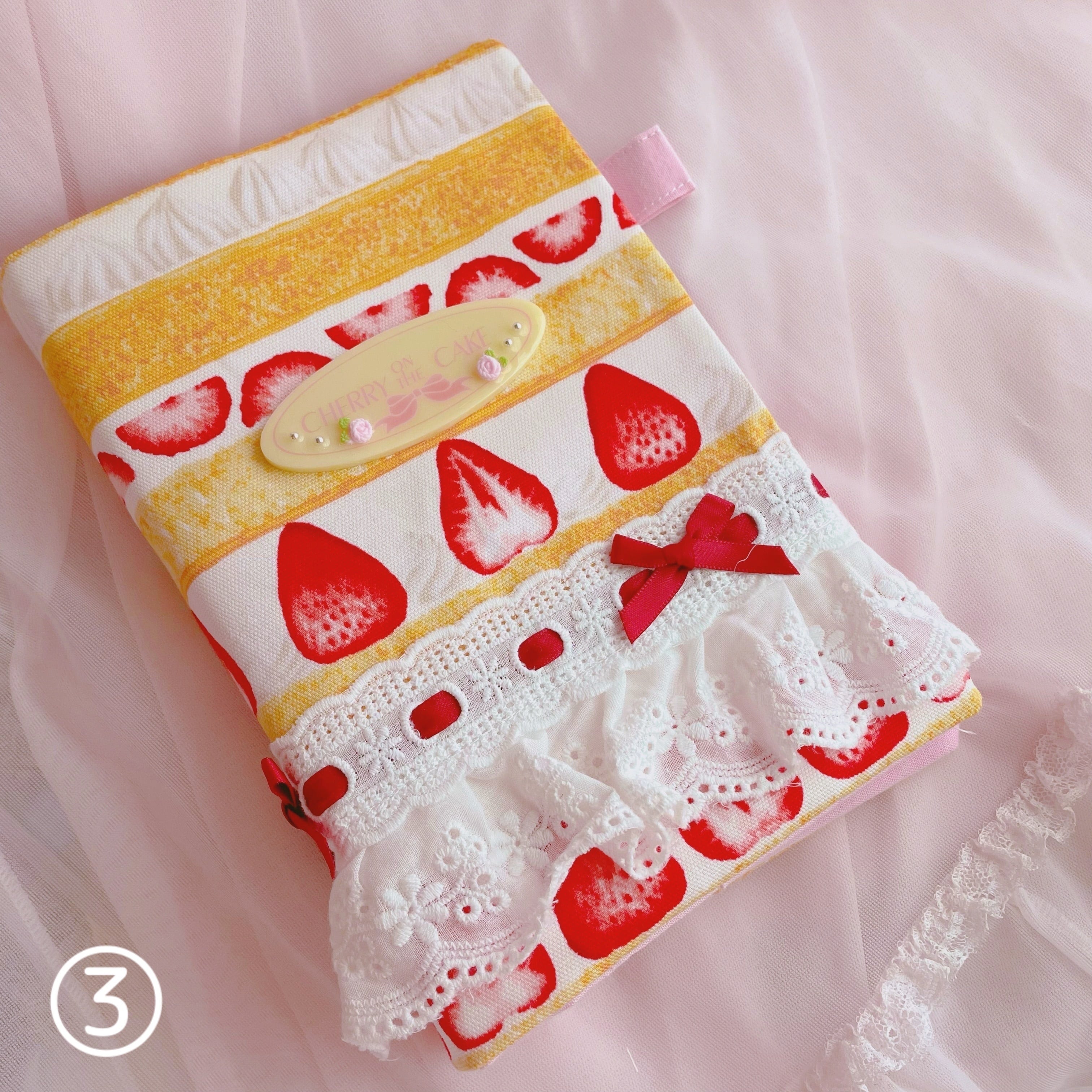 美味しそうなクリームケーキの生地にフリルの綿レース、手描きのチョコプレートを飾ったA6サイズの6穴バインダーです。