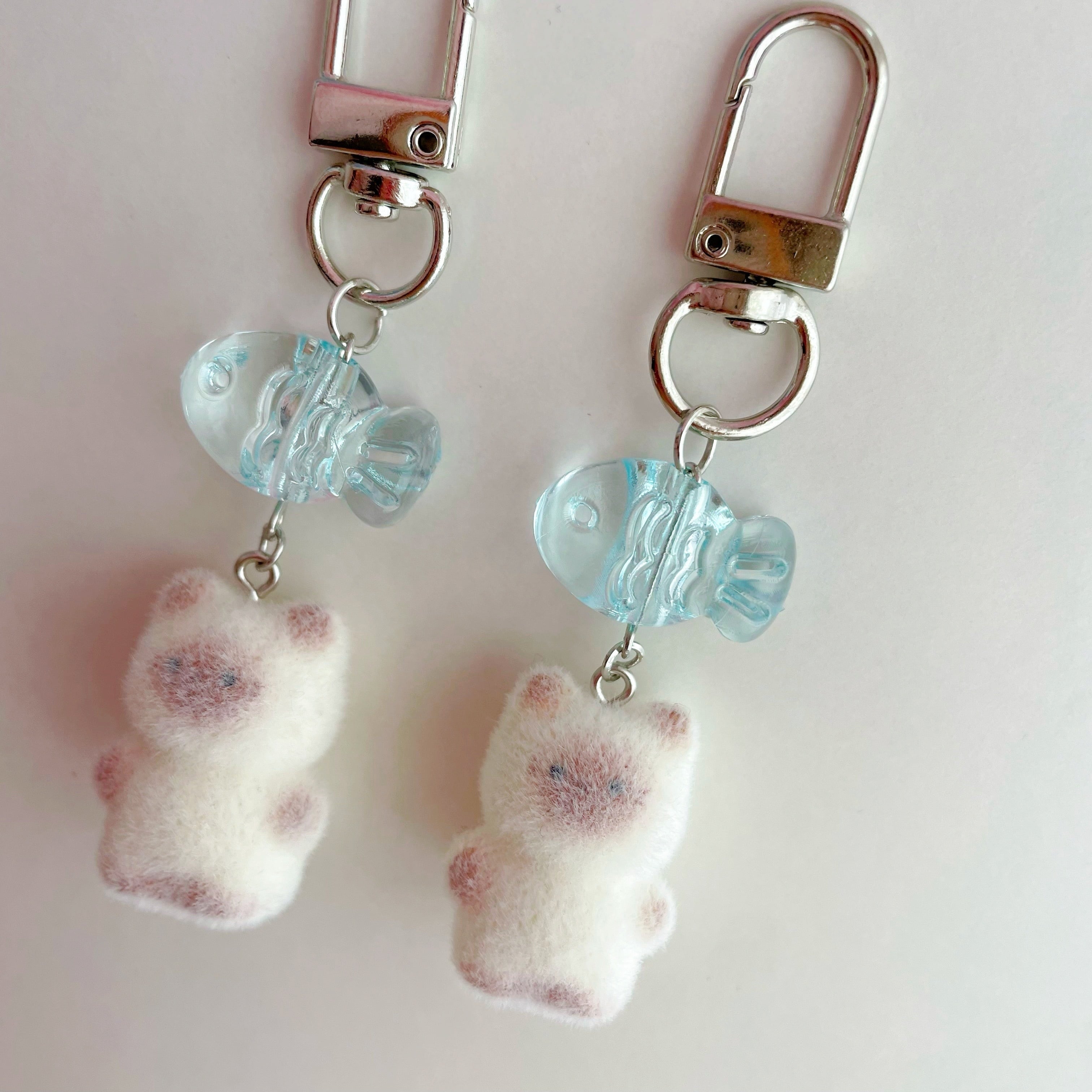 大きなお魚のことを考えているフロッキー素材のネコのキーホルダーです。
