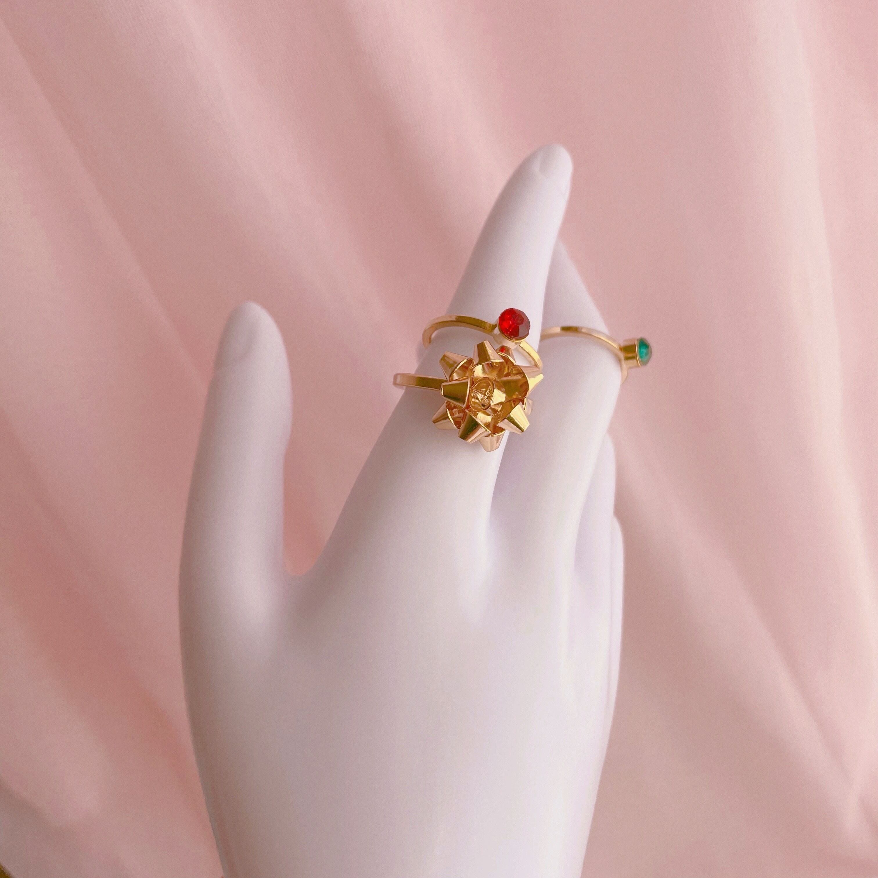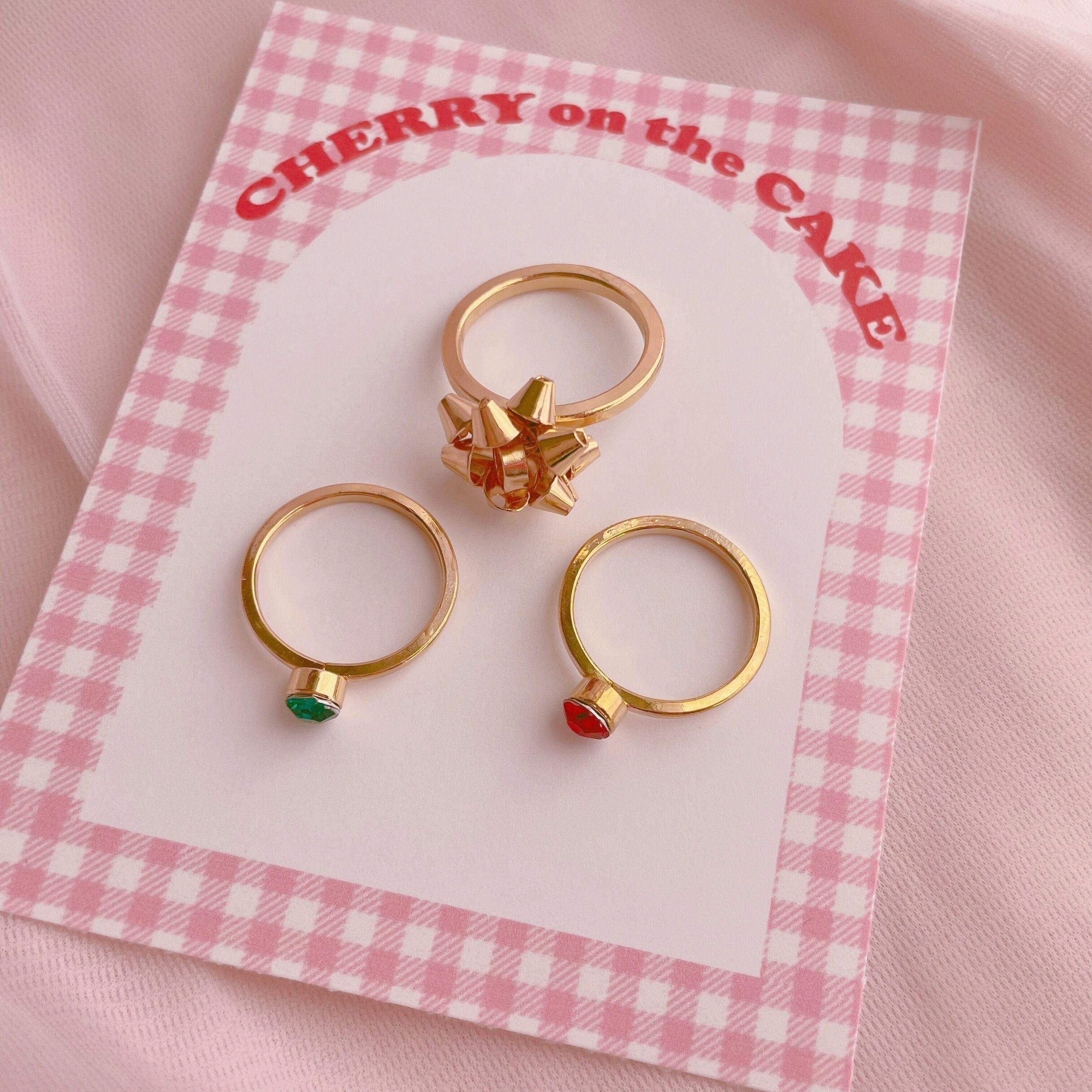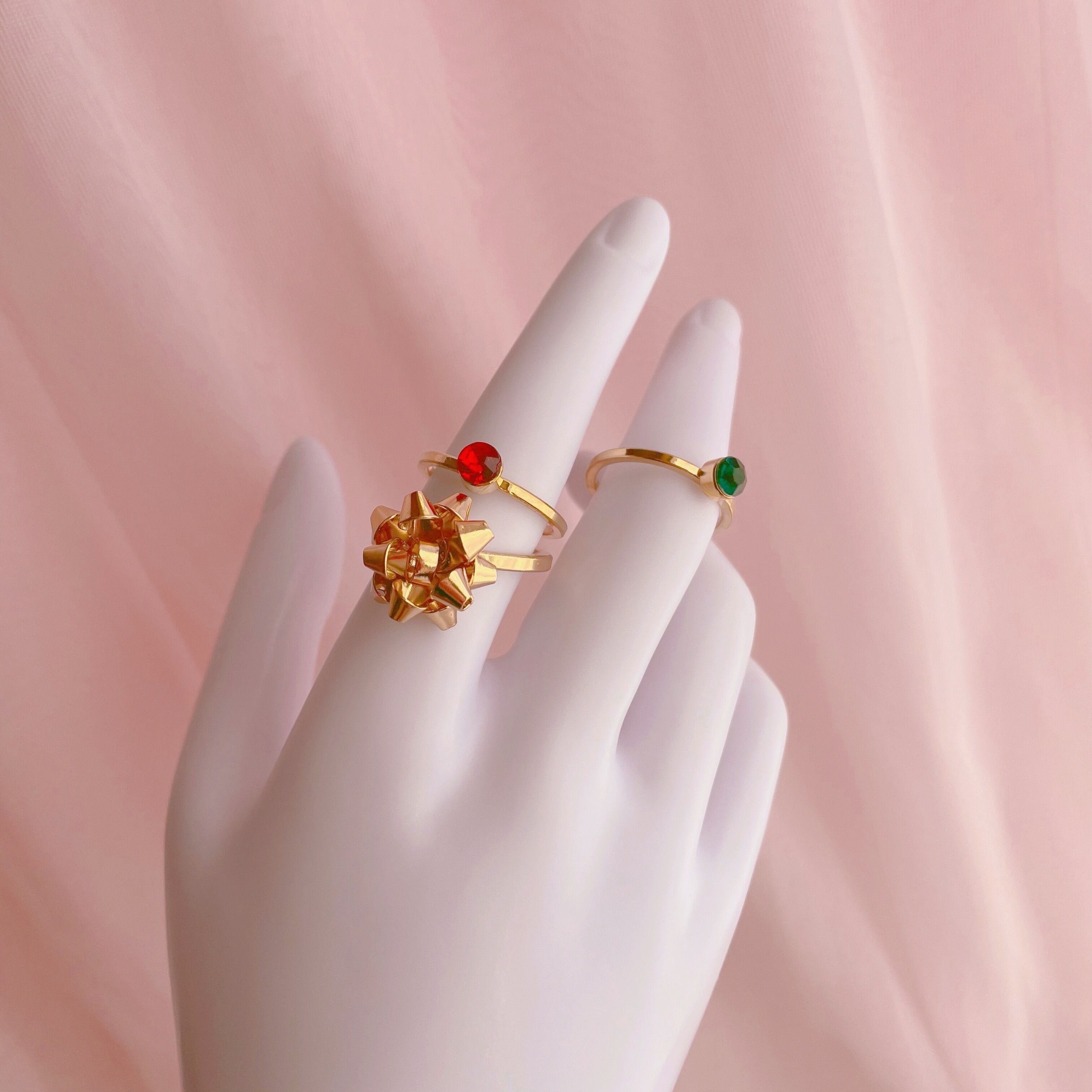 プレゼントのラッピングフラワーモチーフのリングとレッド・グリーンビジューリングの3点セットです。