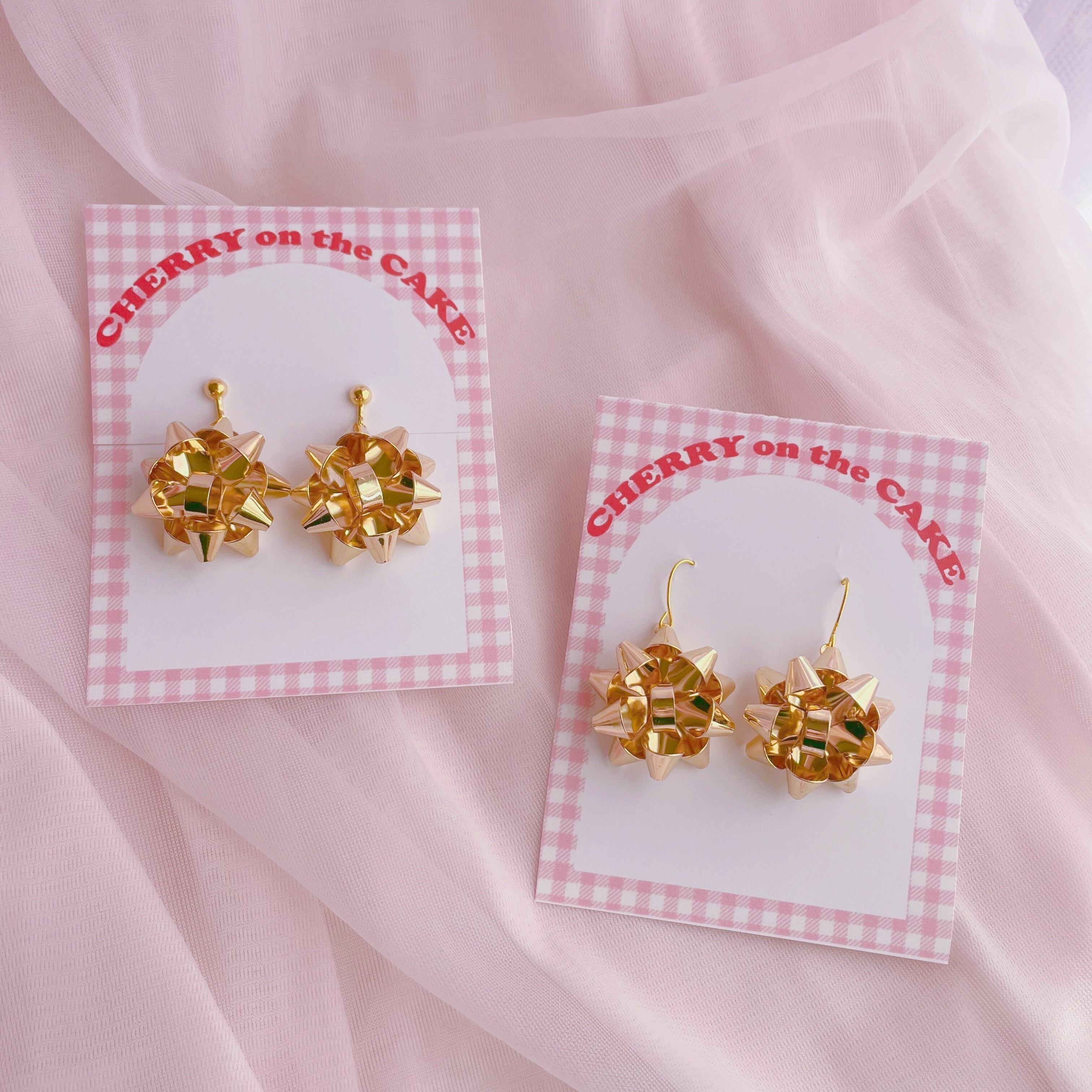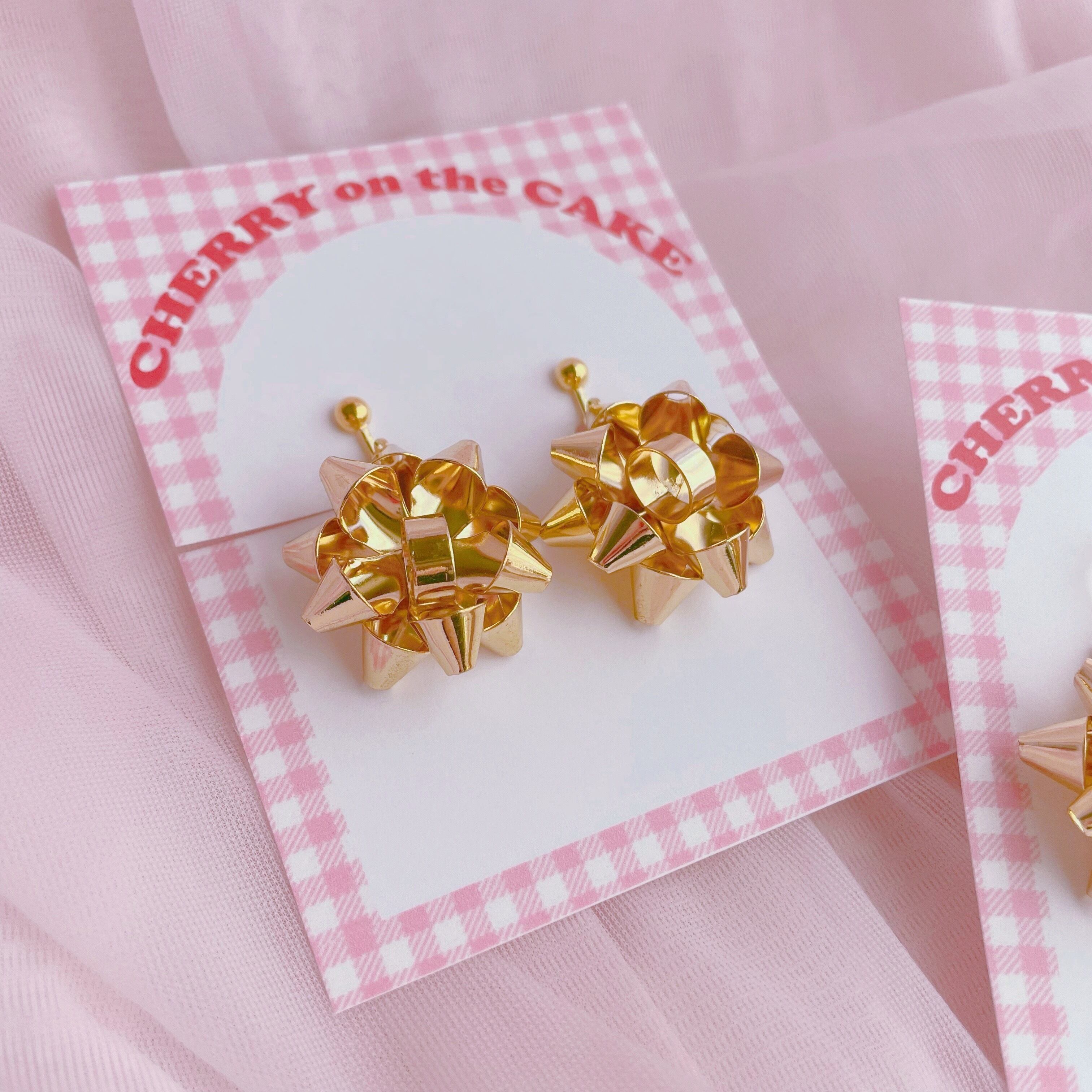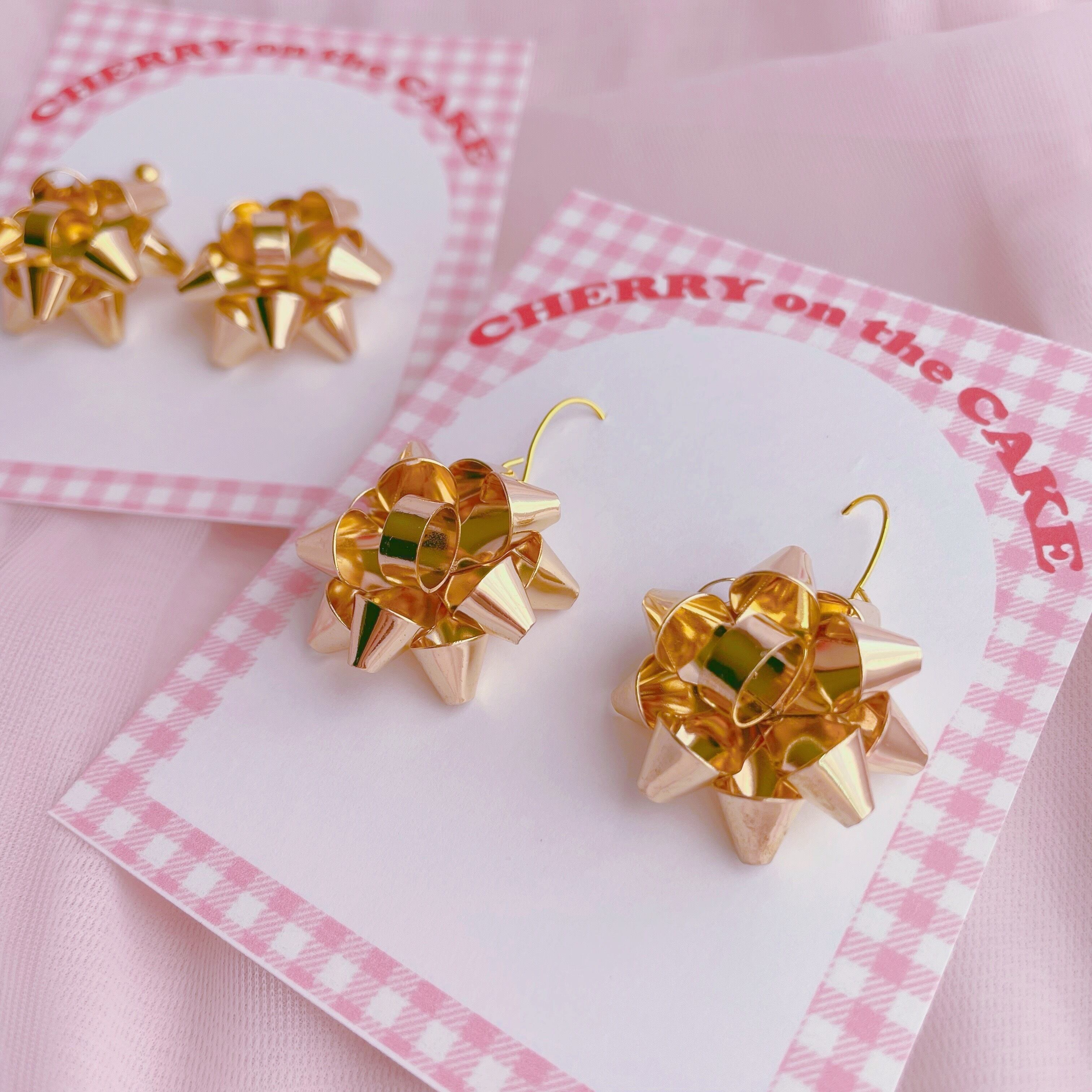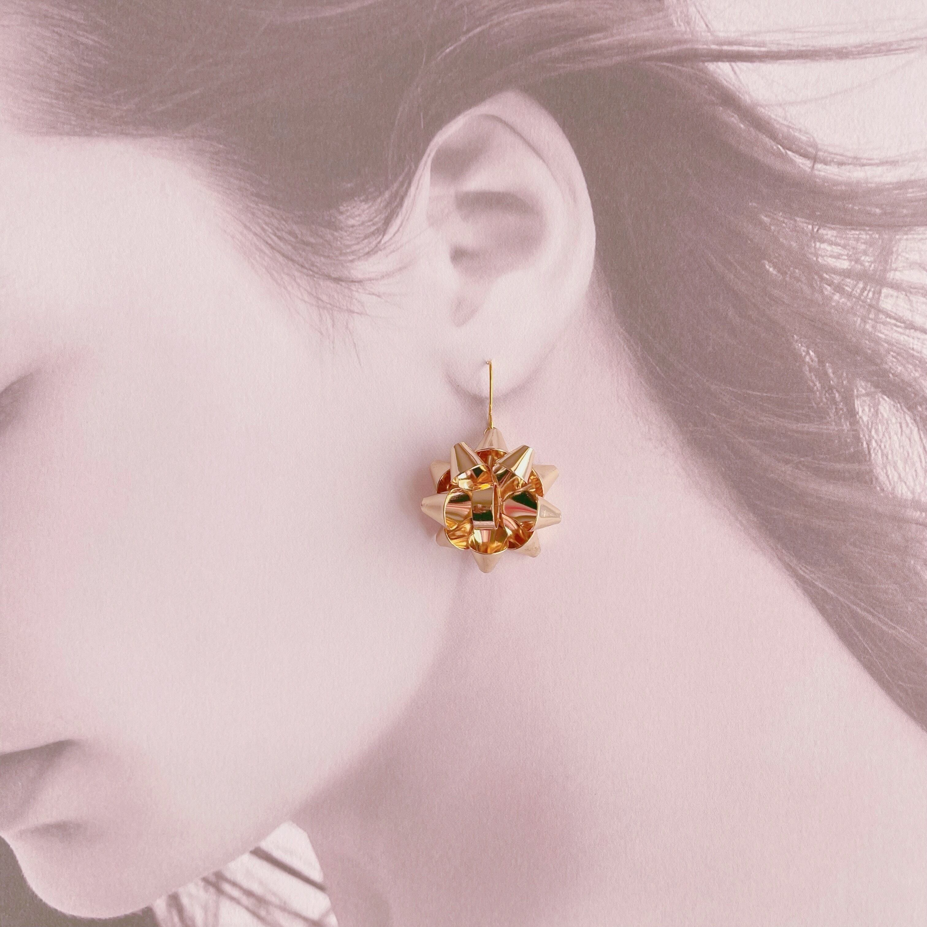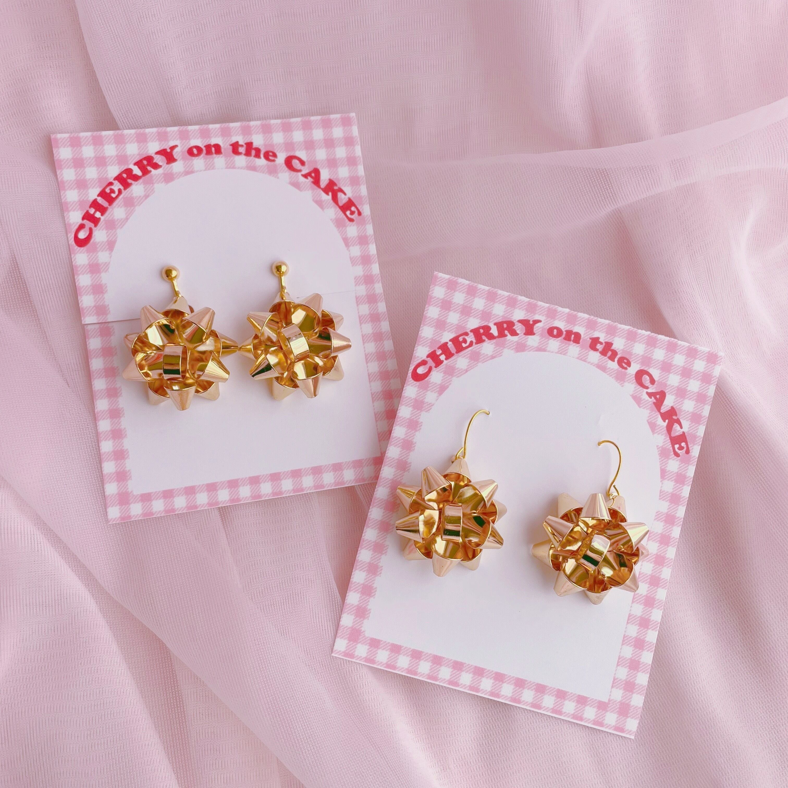 プレゼントのラッピングリボンモチーフのピアス・イヤリングです。