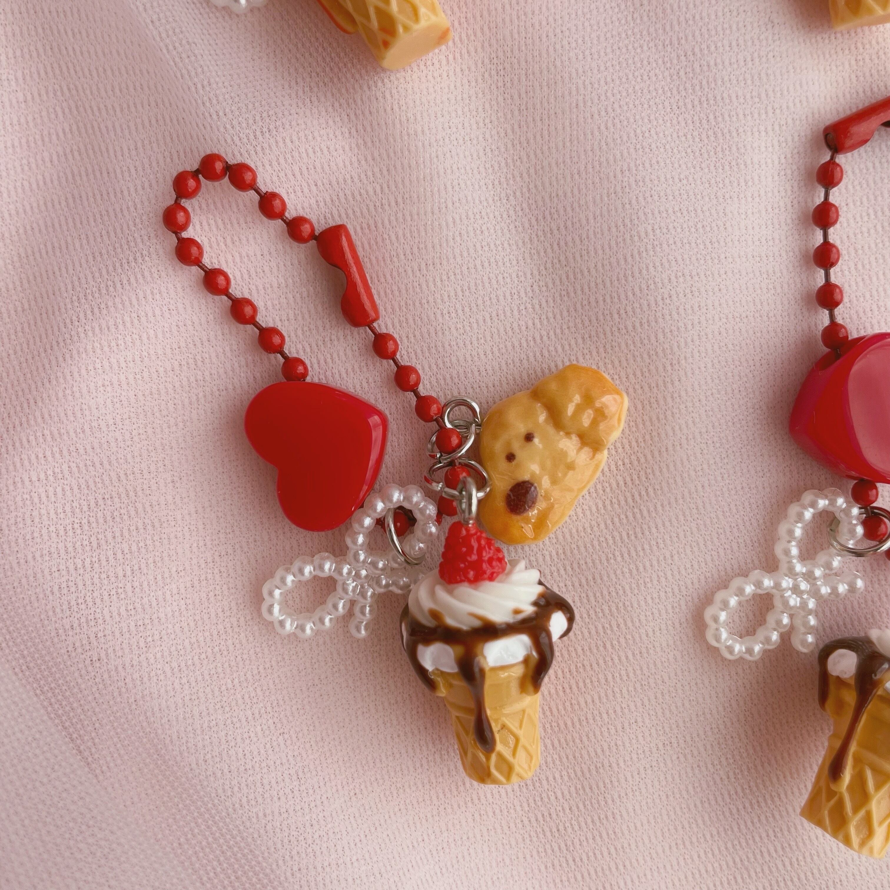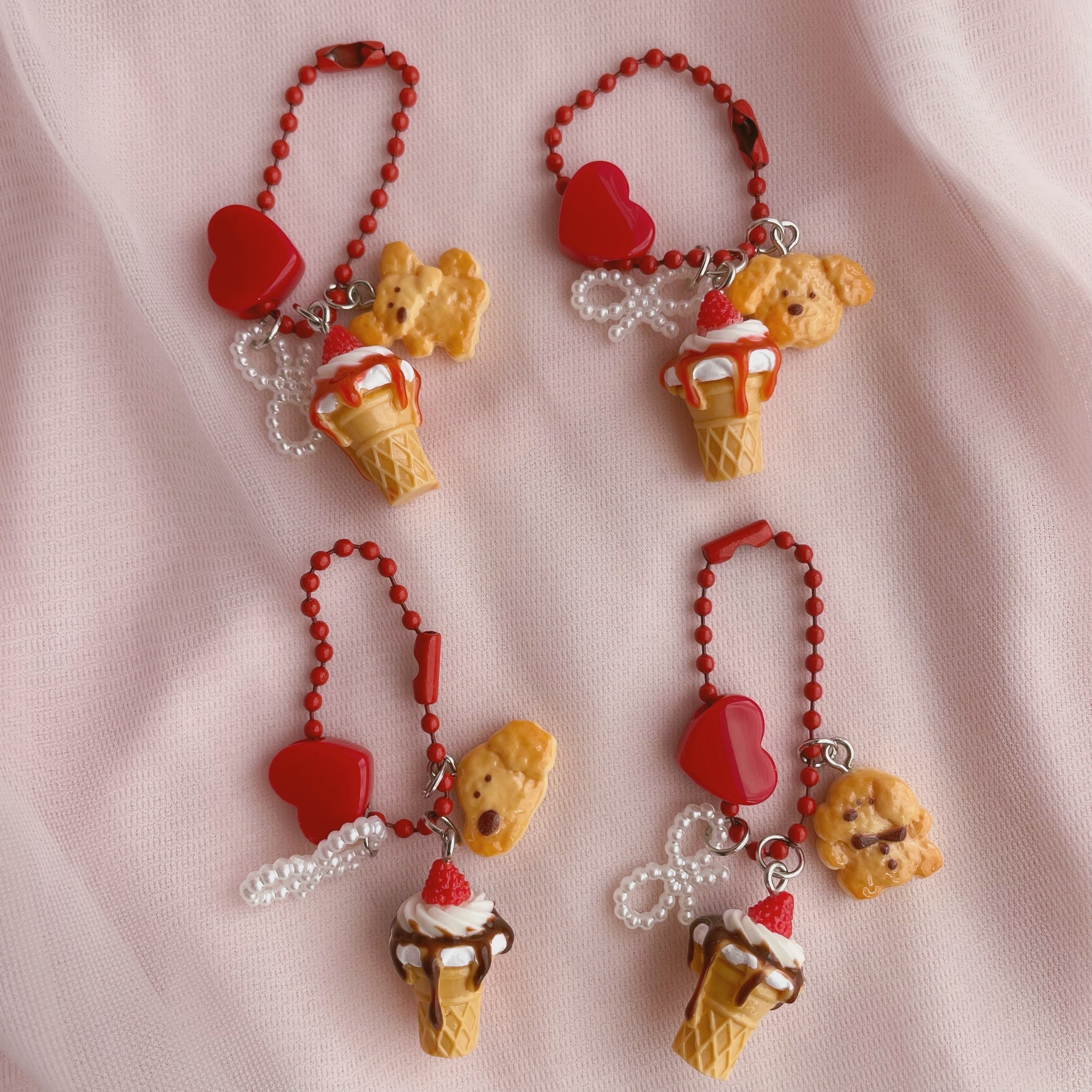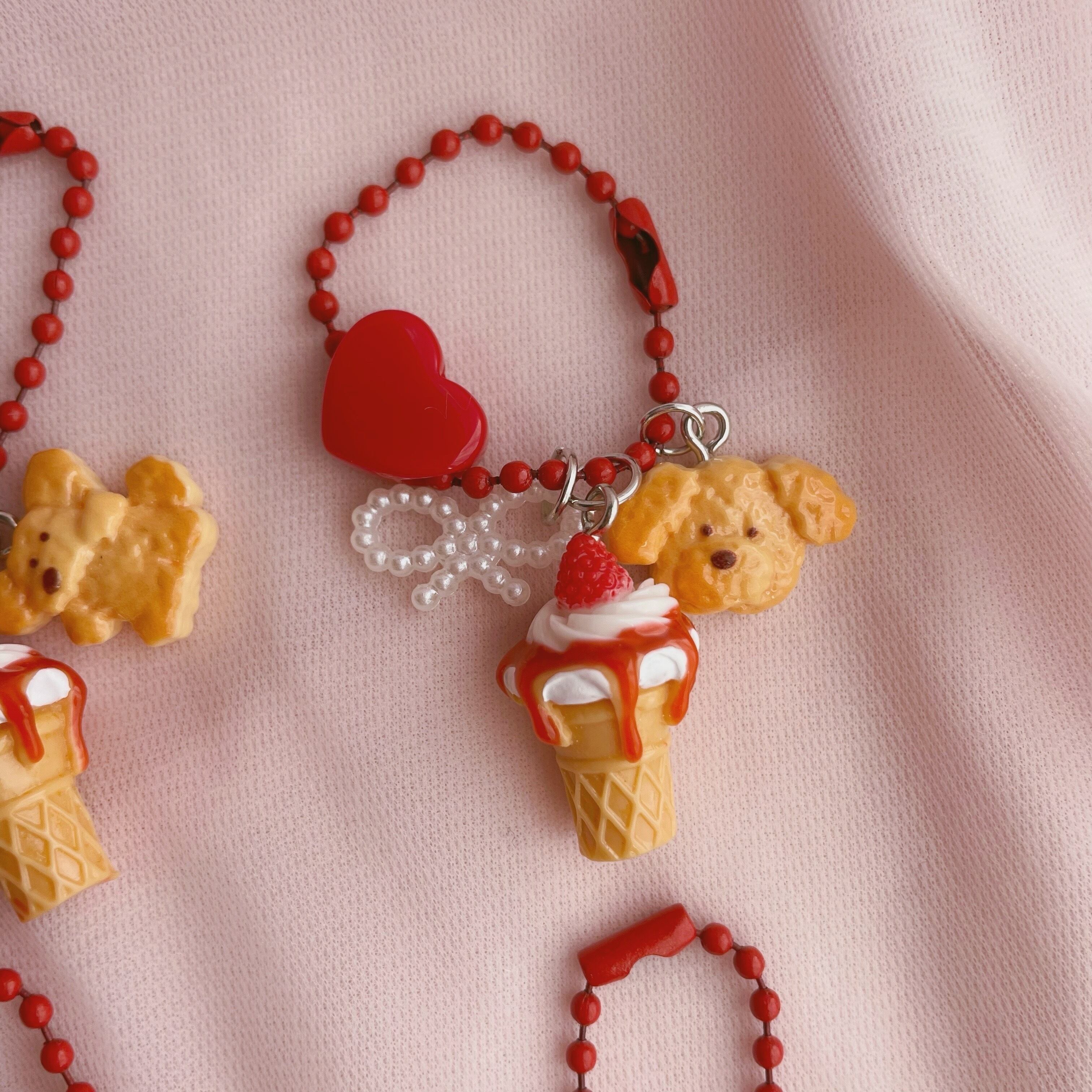 ソースがかかったソフトクリームにわんちゃんのクッキー、リボンとハートのビーズを組み合わせたキーホルダーです。