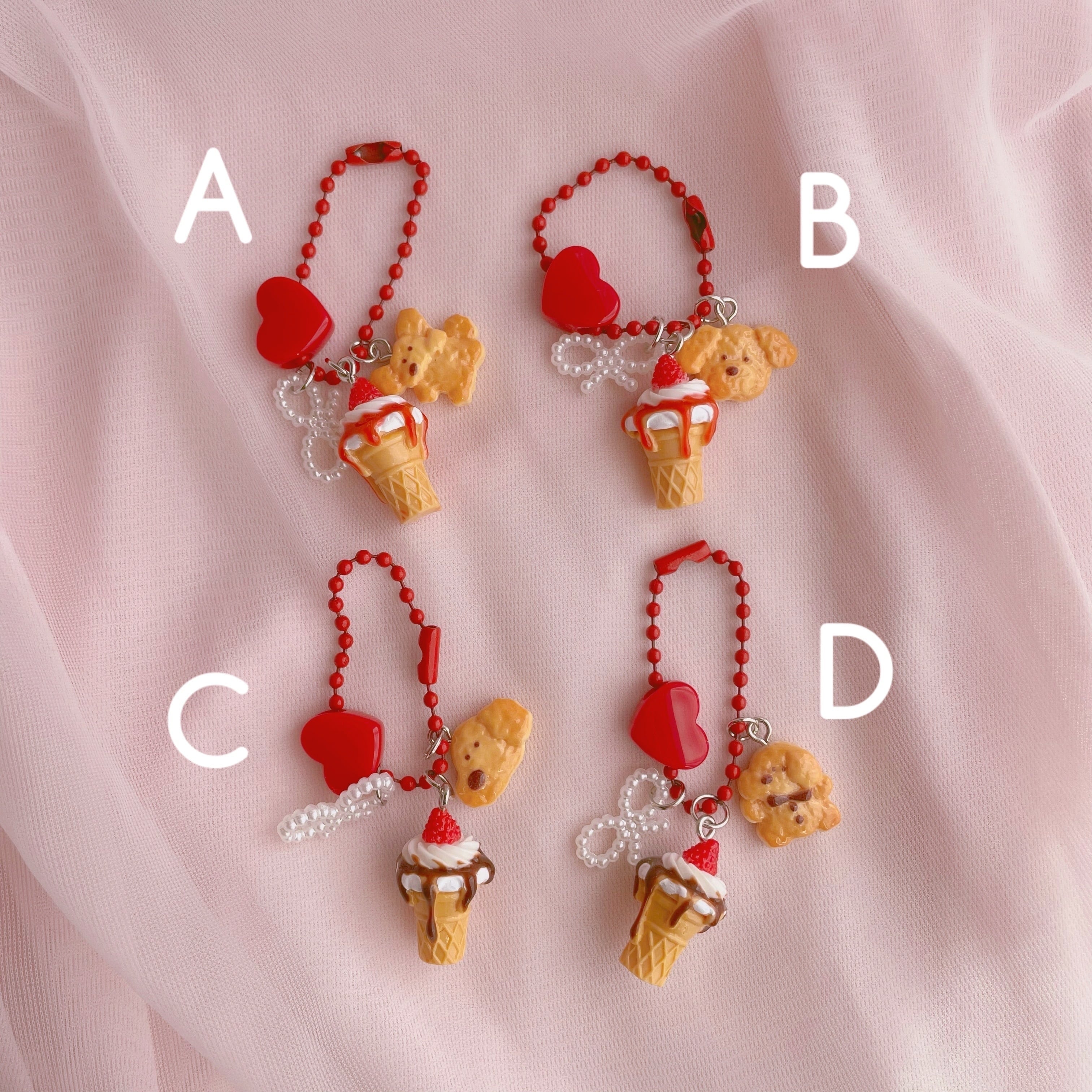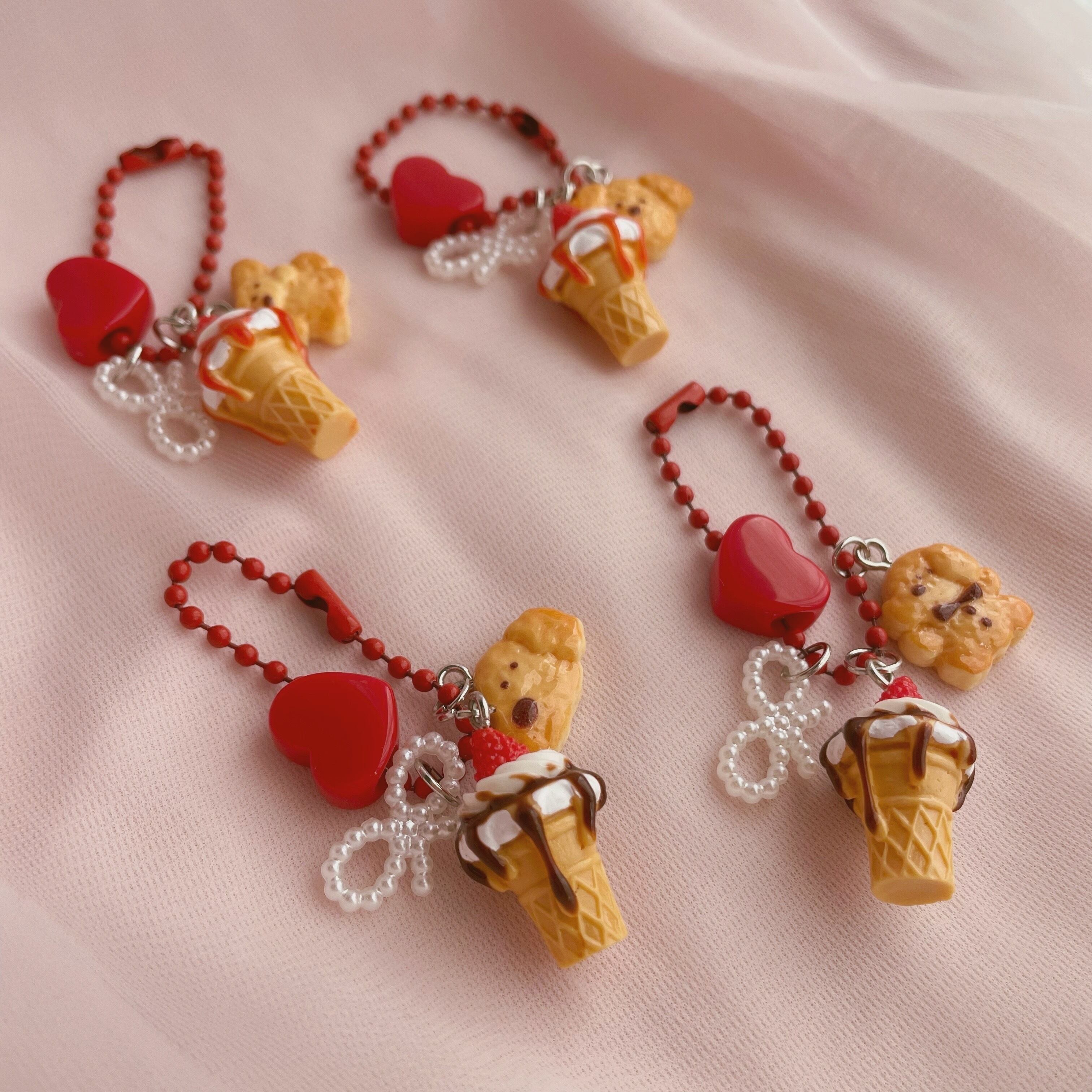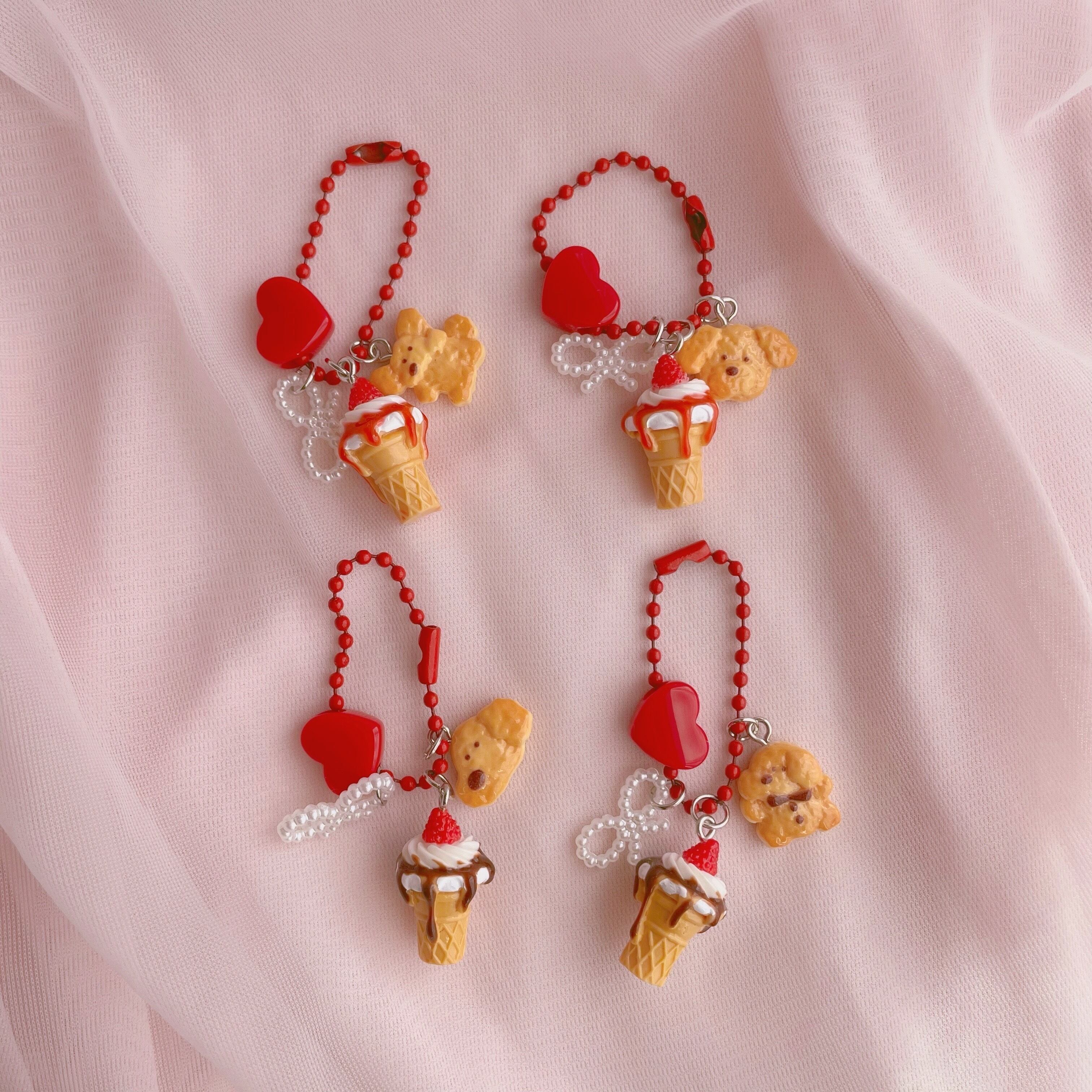 ソースがかかったソフトクリームにわんちゃんのクッキー、リボンとハートのビーズを組み合わせたキーホルダーです。