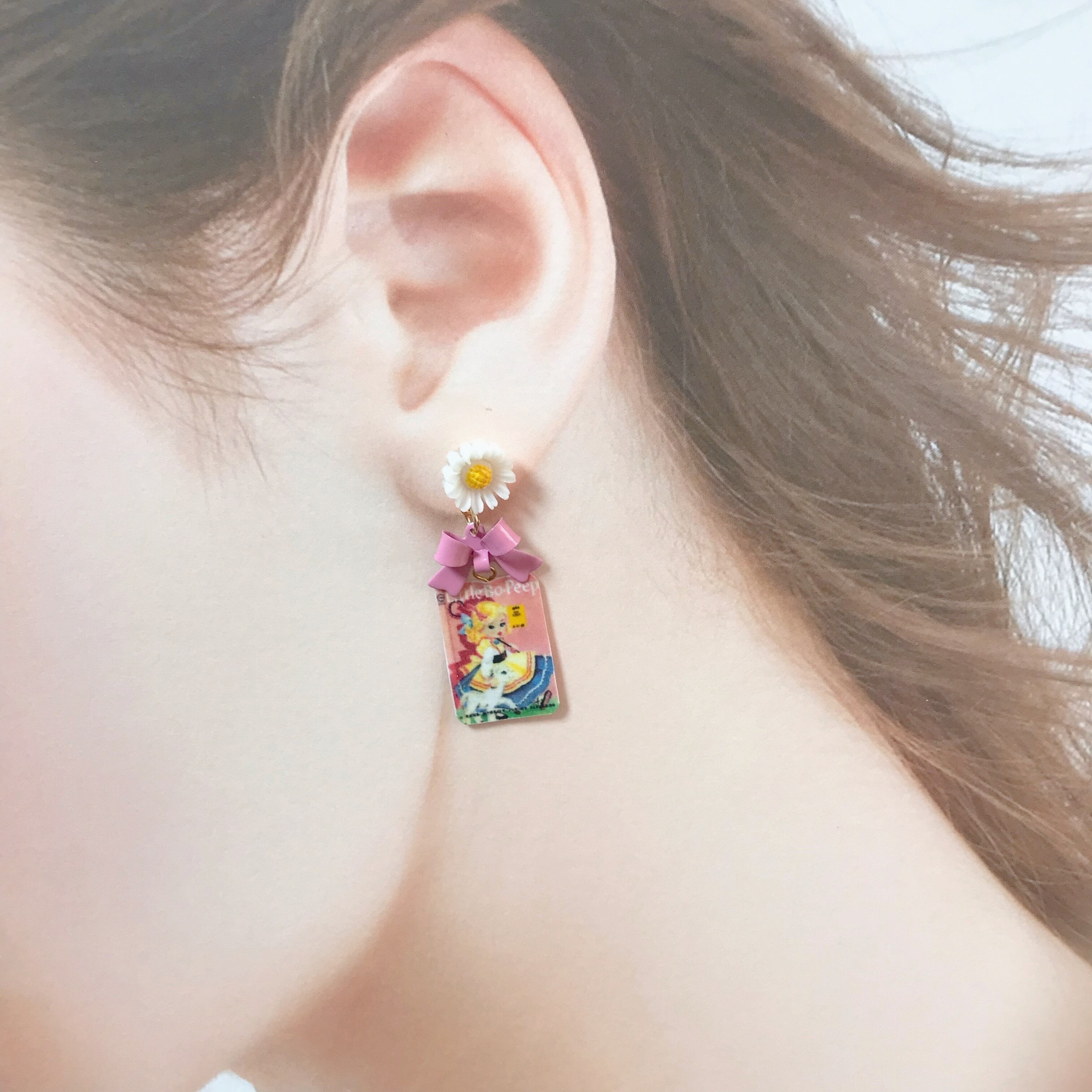ヴィンテージ絵本のデコパージュパーツにエナメルリボンとデイジーカボションを合わせたイヤリング・ピアスです