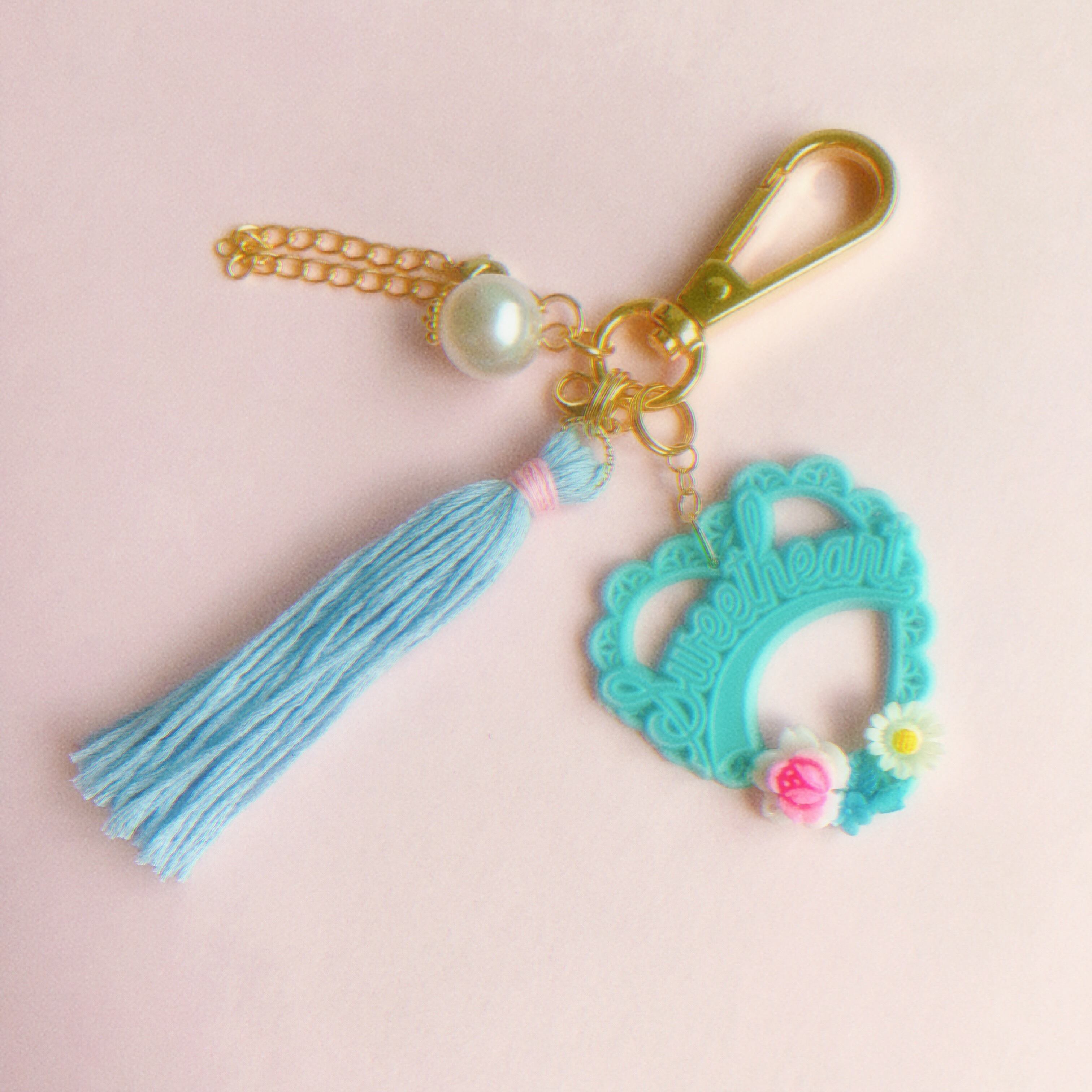ヴィンテージのハートパーツにジャパンカボションを合わせ、タッセルとパールを付けたバッグチャームです。