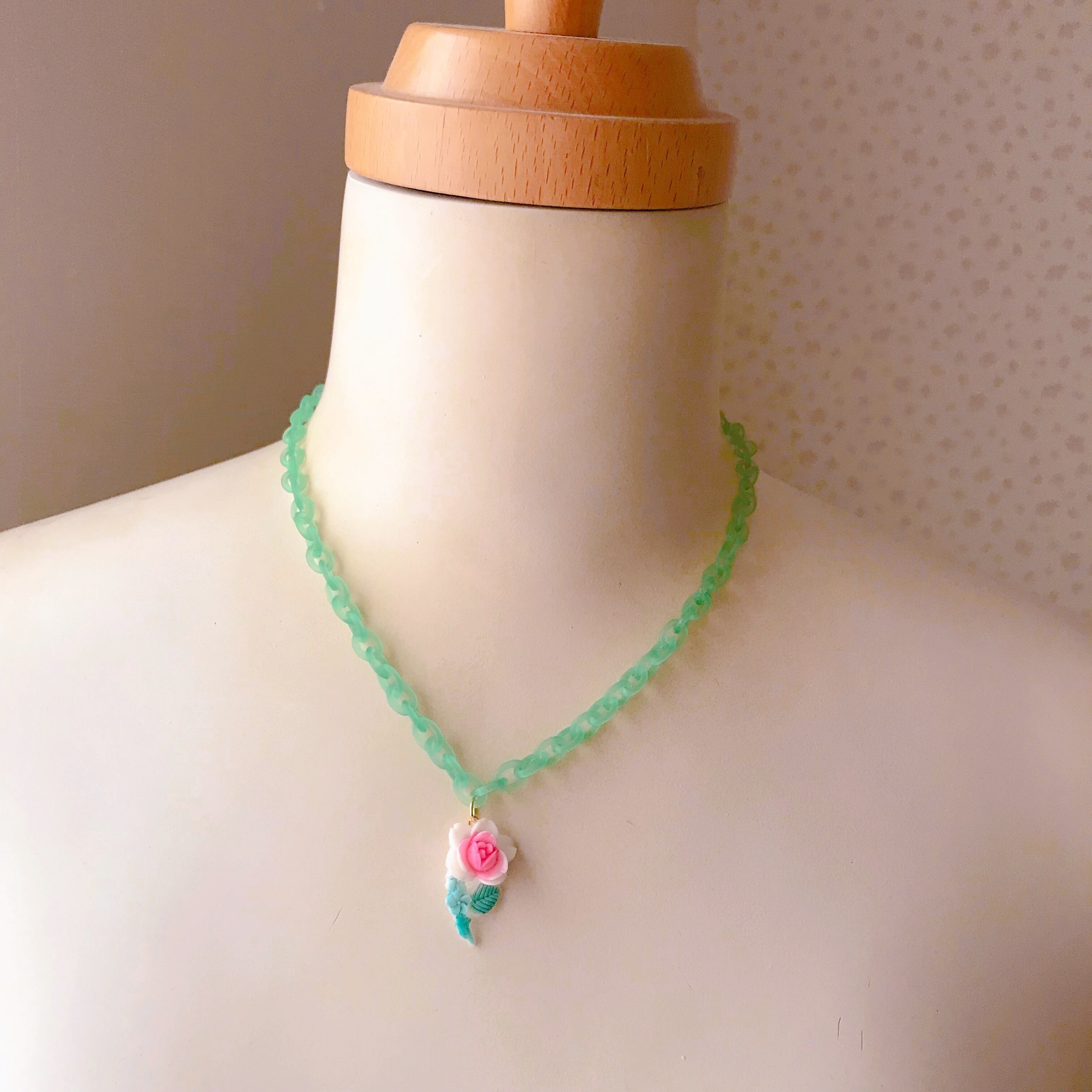 半透明のチェーンにヴィンテージローズカボションを合わせたガーリーネックレスです。