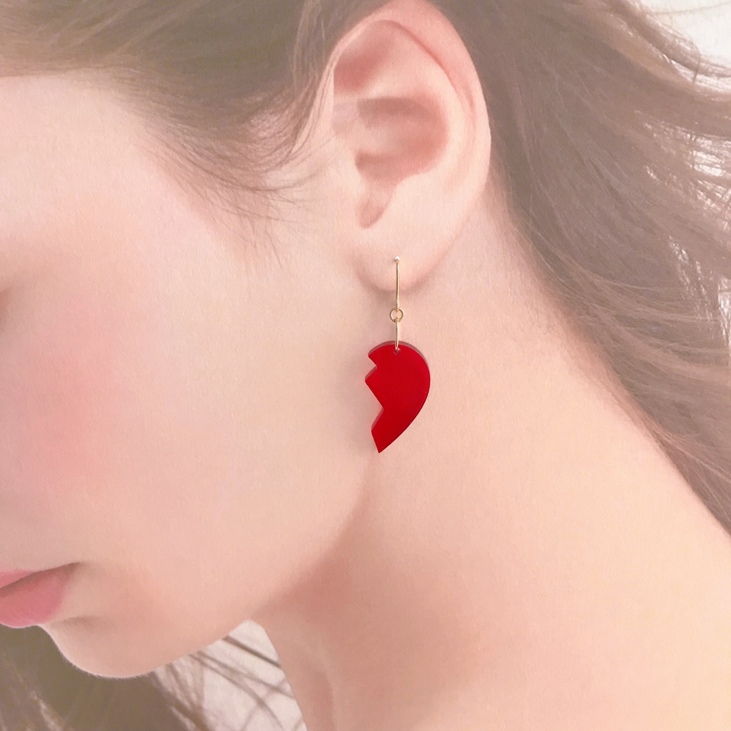 ハートが割れちゃったデザインのアクリル製のハートイヤリング・ピアスです。